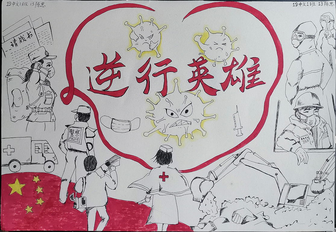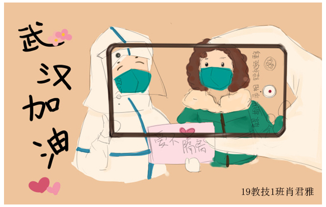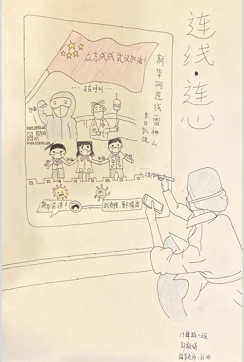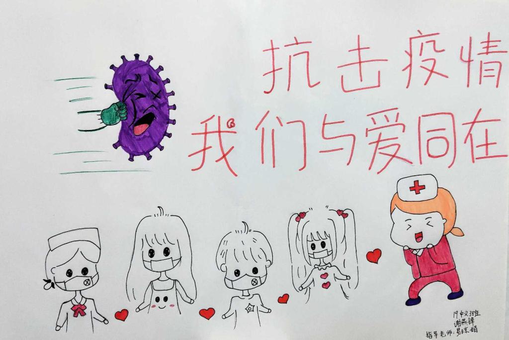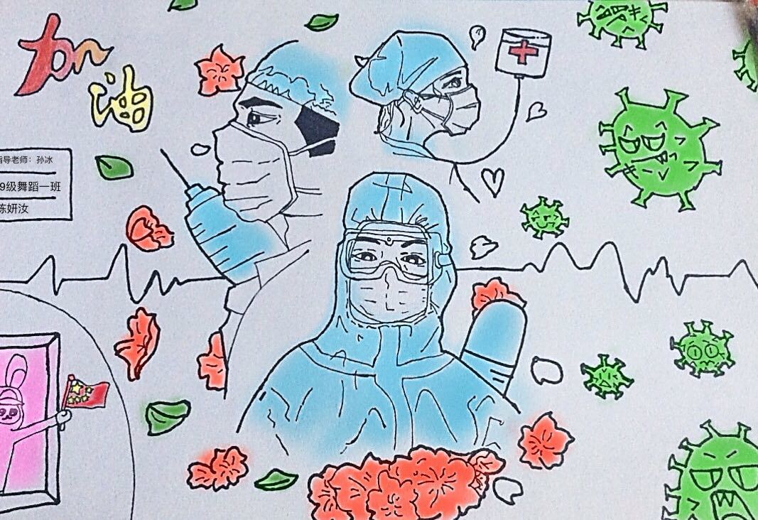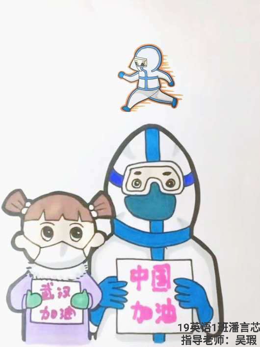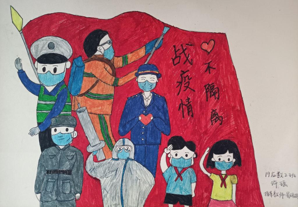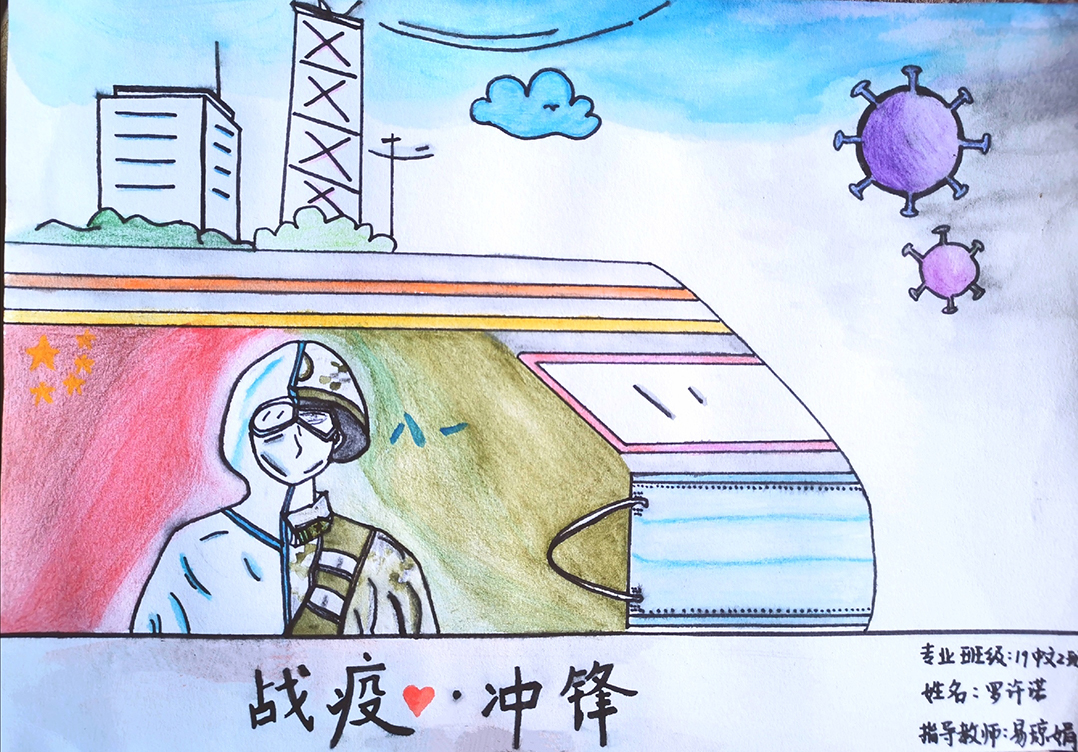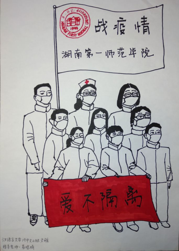简笔画教学是《美术基础》课程内容中的重要组成部分,教学重点在于加强师范生的简笔画绘画技能,提高美术素养与多元化教学能力,为今后的教学实践打下基础。这次主题创作活动是课程组孙冰、曾素艳、谭媛元、吴瑕、易琼娟五位教师共同探究新时代课堂教学中“课程思政”的一次教学实践。针对抗击疫情期间师生们对抗疫进展与社会现象的关注,结合美术创作“以人民为中心”的指导思想,课程组五位教师通过多次研讨课程内容与授课方式,决定结合慕课平台线上教学进度与课程内容,组织所授班级包括科教、体育、音乐、应数等十个专业926名员工(师范类非美术学专业)共同参与“战疫情·爱不隔离”简笔画主题创作。同学们在掌握简笔画学习与表现规律的同时,将抗疫期间的英雄事迹、感人镜头用画笔展现,将感动之情运用隐喻、借喻、拟人或直抒胸臆等多种手法表现,表达青年的爱国情怀与内心感悟。课程组五位教师在十个班级中选出了75幅优秀作品进行线上展览,呈现出不同学科专业员工们凭借艺术的力量以“艺”抗“疫”。