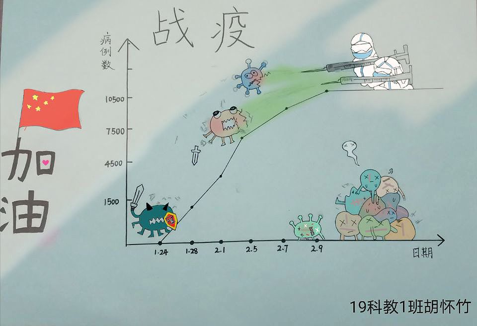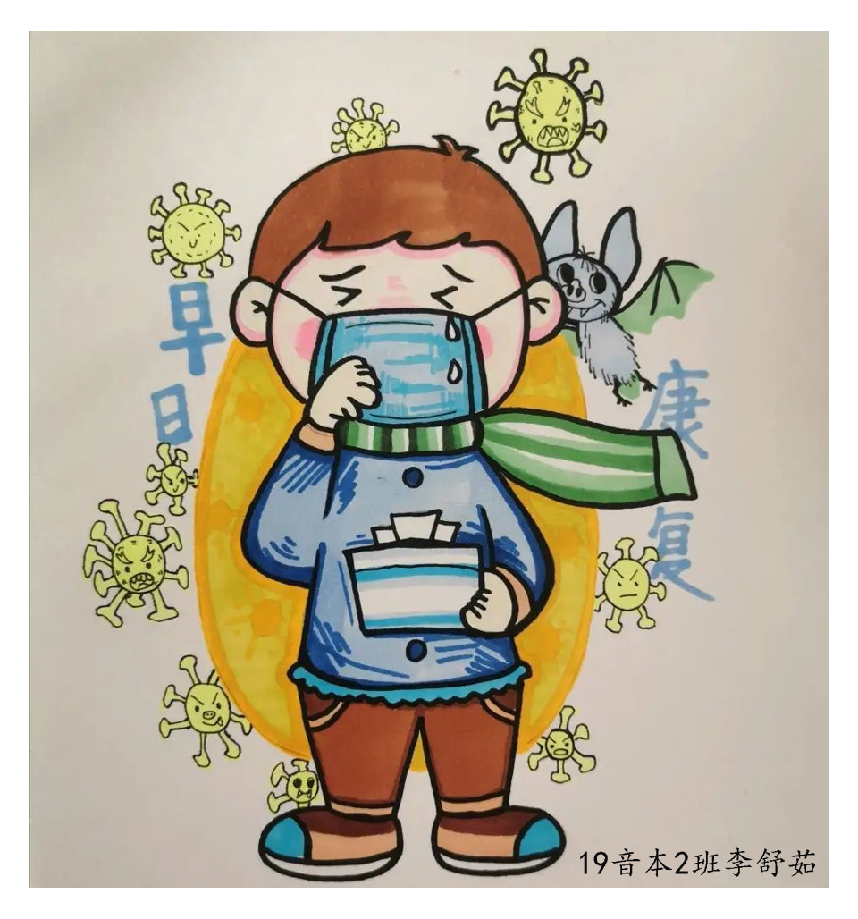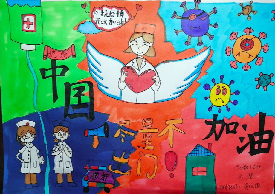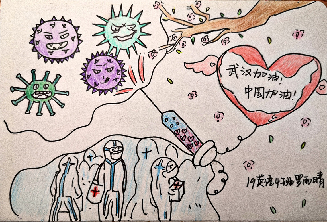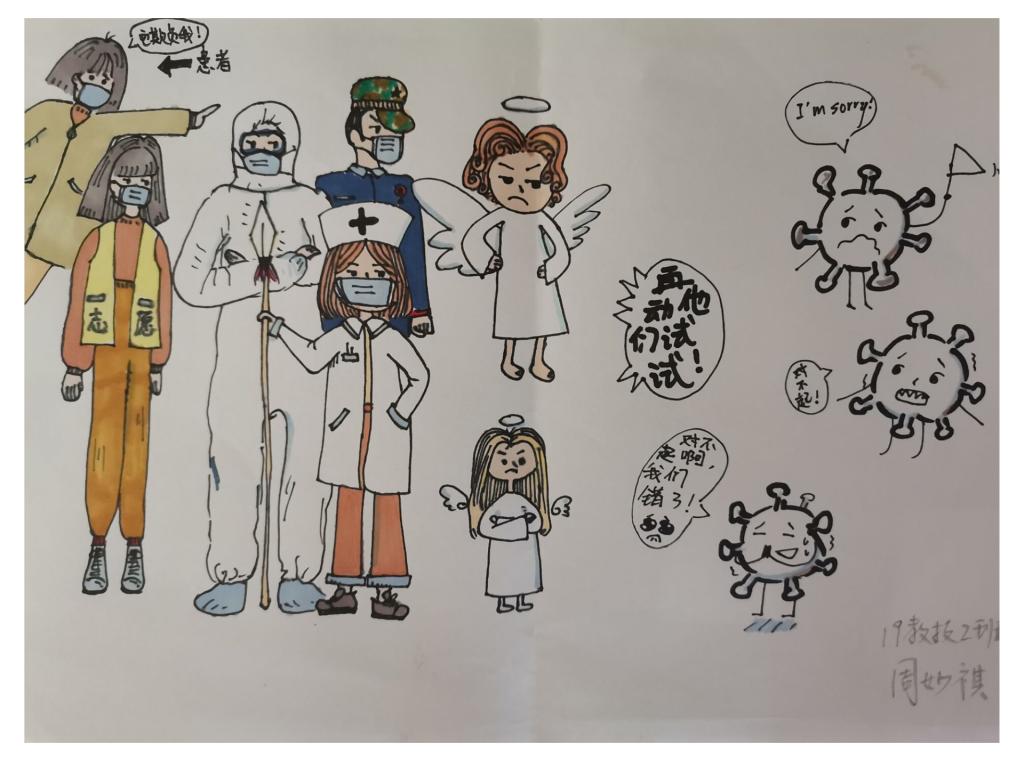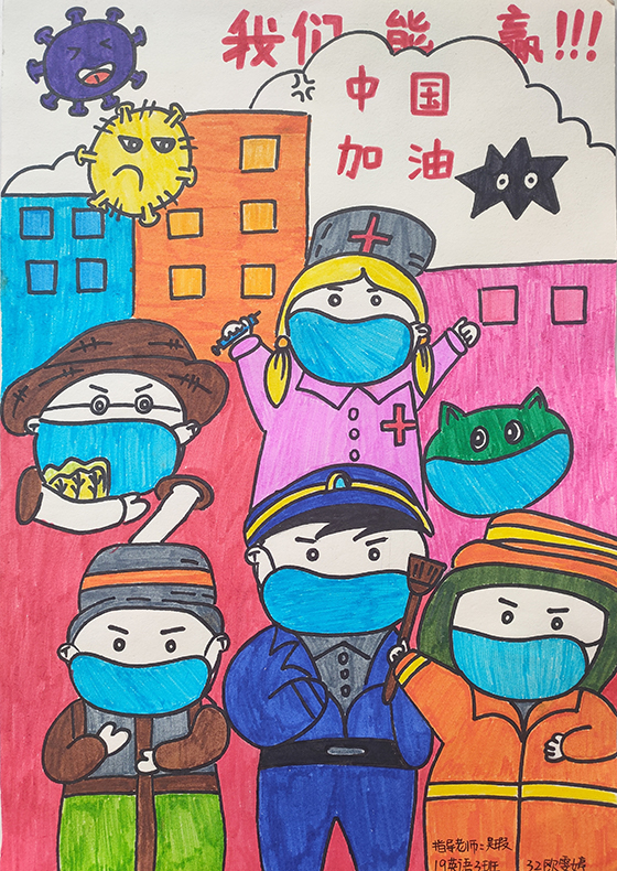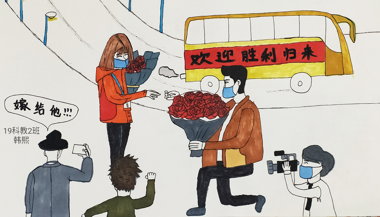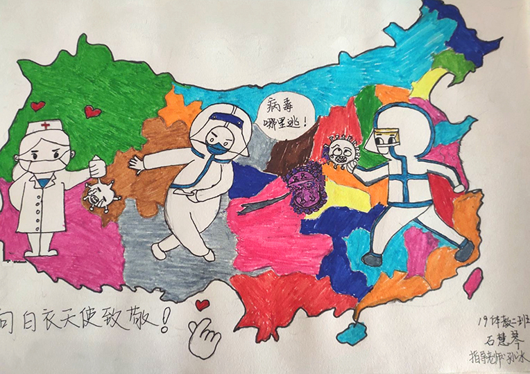 简笔画教学是《美术基础》课程内容中的重要组成部分,教学重点在于加强师范生的简笔画绘画技能,提高美术素养与多元化教学能力,为今后的教学实践打下基础。这次主题创作活动是课程组孙冰、曾素艳、谭媛元、吴瑕、易琼娟五位教师共同探究新时代课堂教学中“课程思政”的一次教学实践。针对抗击疫情期间师生们对抗疫进展与社会现象的关注,结合美术创作“以人民为中心”的指导思想,课程组五位教师通过多次研讨课程内容与授课方式,决定结合慕课平台线上教学进度与课程内容,组织所授班级包括科教、体育、音乐、应数等十个专业926名员工(师范类非美术学专业)共同参与“战疫情·爱不隔离”简笔画主题创作。同学们在掌握简笔画学习与表现规律的同时,将抗疫期间的英雄事迹、感人镜头用画笔展现,将感动之情运用隐喻、借喻、拟人或直抒胸臆等多种手法表现,表达青年的爱国情怀与内心感悟。课程组五位教师在十个班级中选出了75幅优秀作品进行线上展览,呈现出不同学科专业员工们凭借艺术的力量以“艺”抗“疫”。