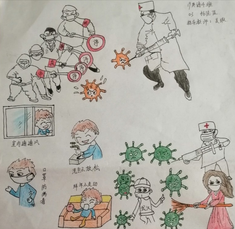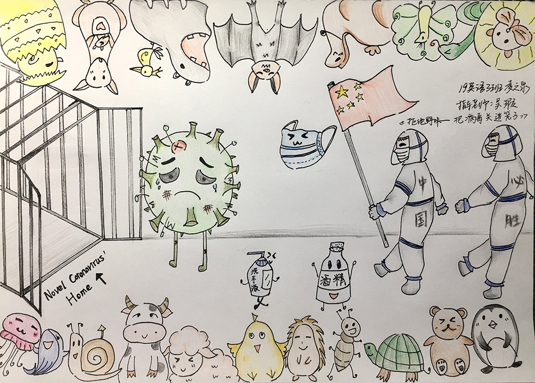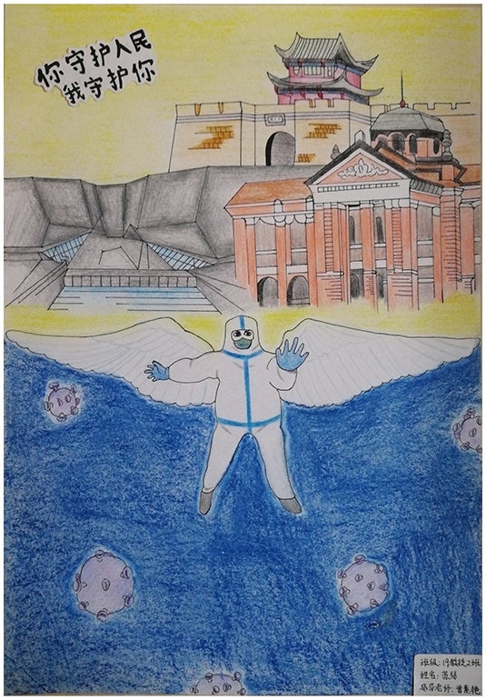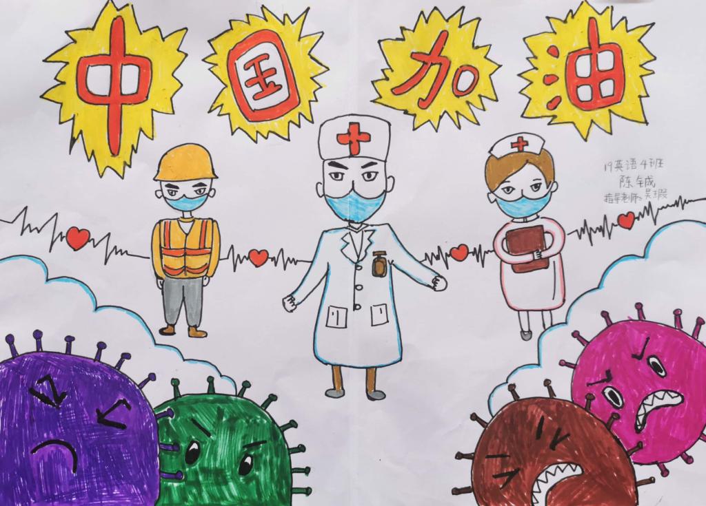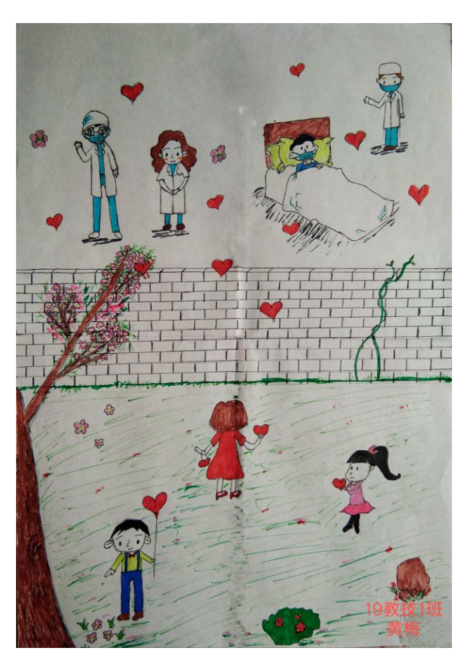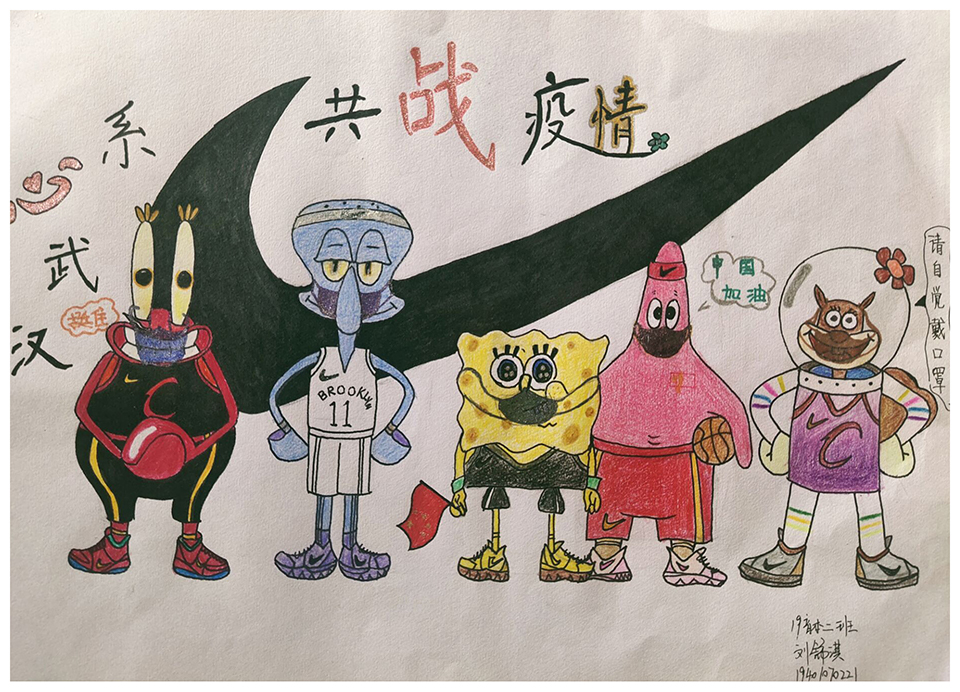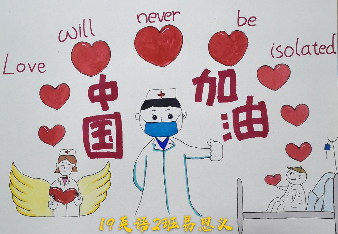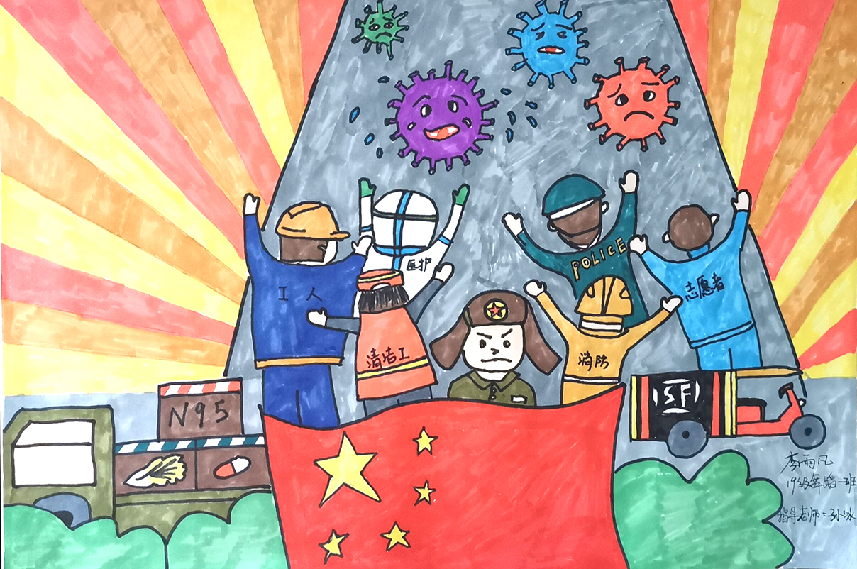 简笔画教学是《美术基础》课程内容中的重要组成部分,教学重点在于加强师范生的简笔画绘画技能,提高美术素养与多元化教学能力,为今后的教学实践打下基础。这次主题创作活动是课程组孙冰、曾素艳、谭媛元、吴瑕、易琼娟五位教师共同探究新时代课堂教学中“课程思政”的一次教学实践。针对抗击疫情期间师生们对抗疫进展与社会现象的关注,结合美术创作“以人民为中心”的指导思想,课程组五位教师通过多次研讨课程内容与授课方式,决定结合慕课平台线上教学进度与课程内容,组织所授班级包括科教、体育、音乐、应数等十个专业926名员工(师范类非美术学专业)共同参与“战疫情·爱不隔离”简笔画主题创作。同学们在掌握简笔画学习与表现规律的同时,将抗疫期间的英雄事迹、感人镜头用画笔展现,将感动之情运用隐喻、借喻、拟人或直抒胸臆等多种手法表现,表达青年的爱国情怀与内心感悟。课程组五位教师在十个班级中选出了75幅优秀作品进行线上展览,呈现出不同学科专业员工们凭借艺术的力量以“艺”抗“疫”。
