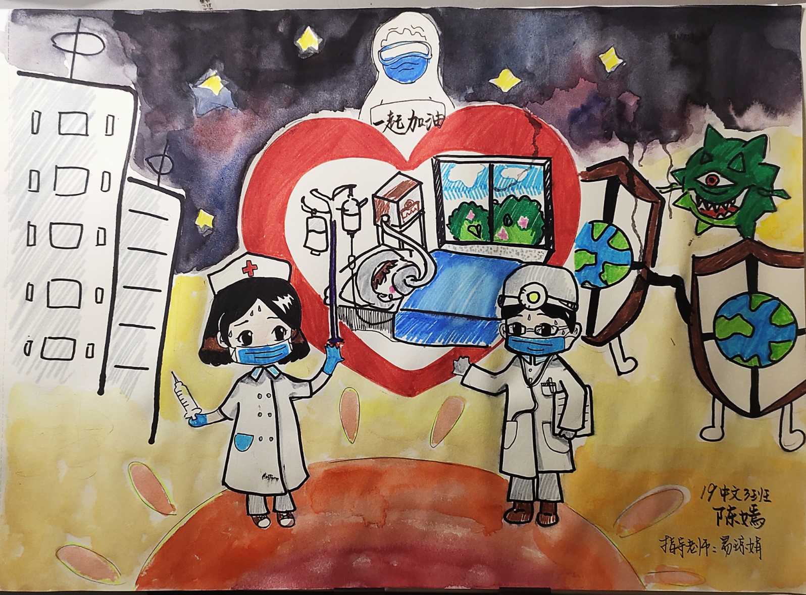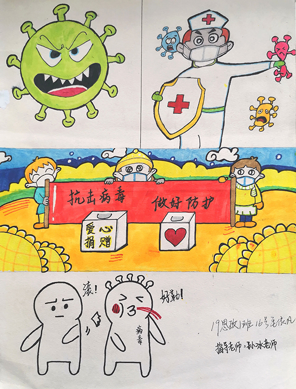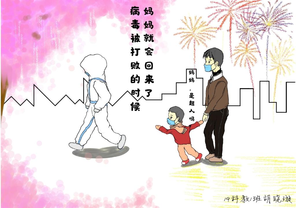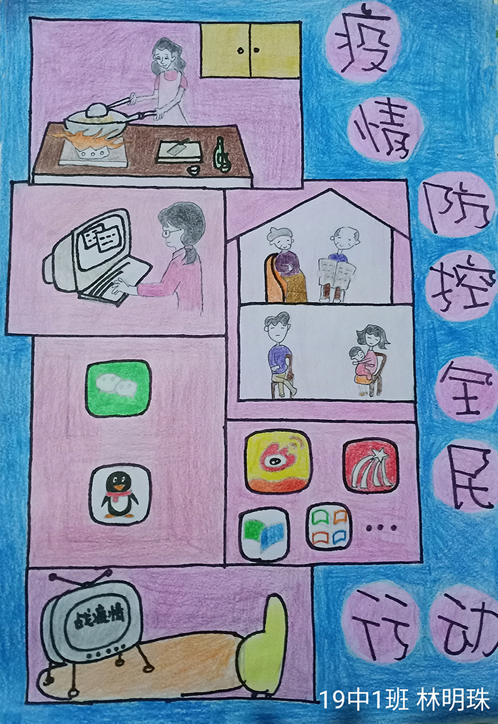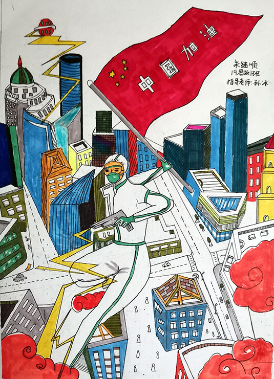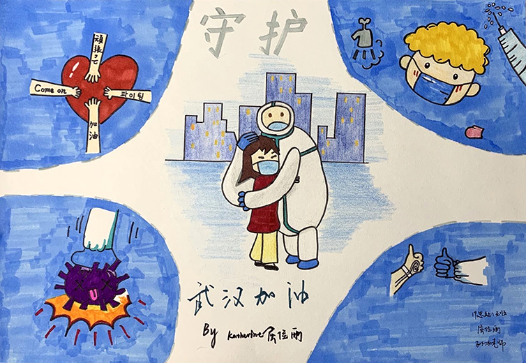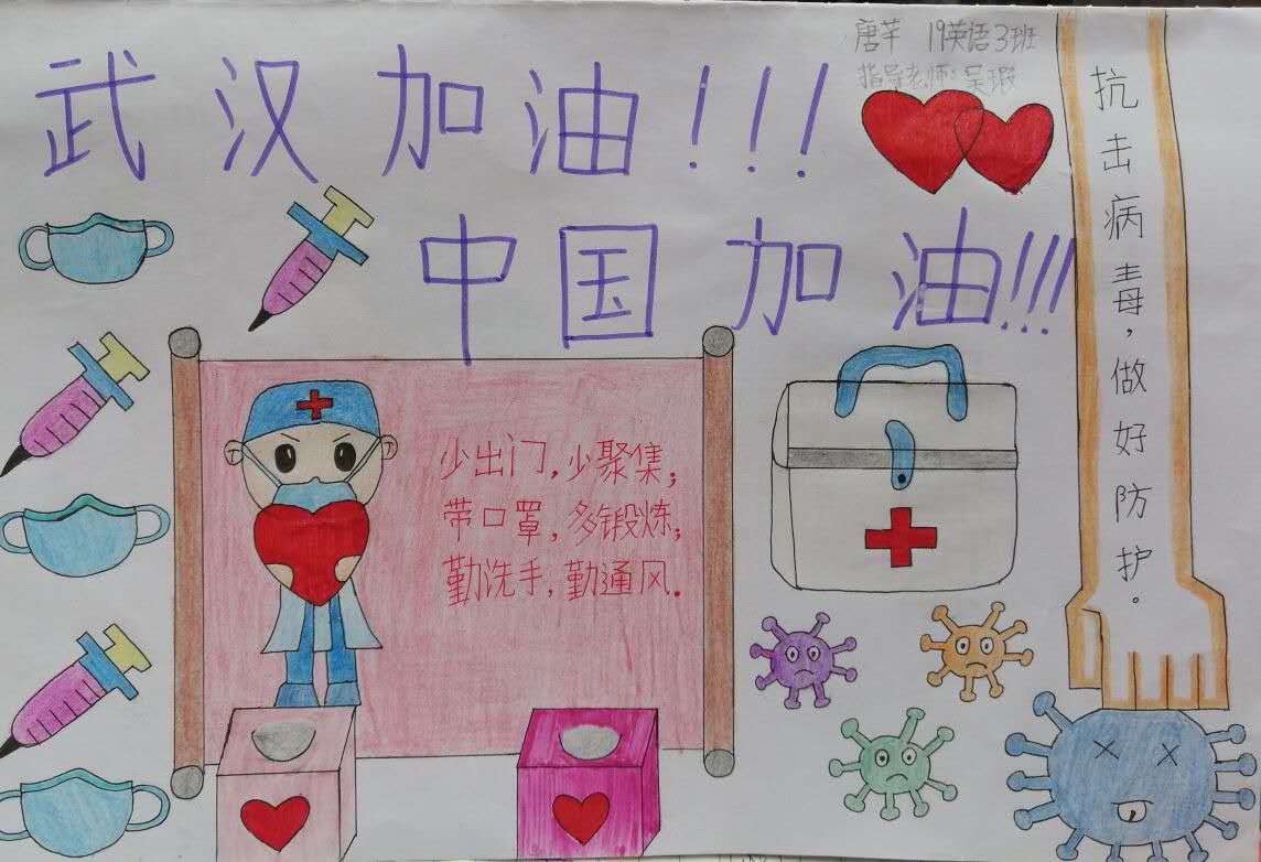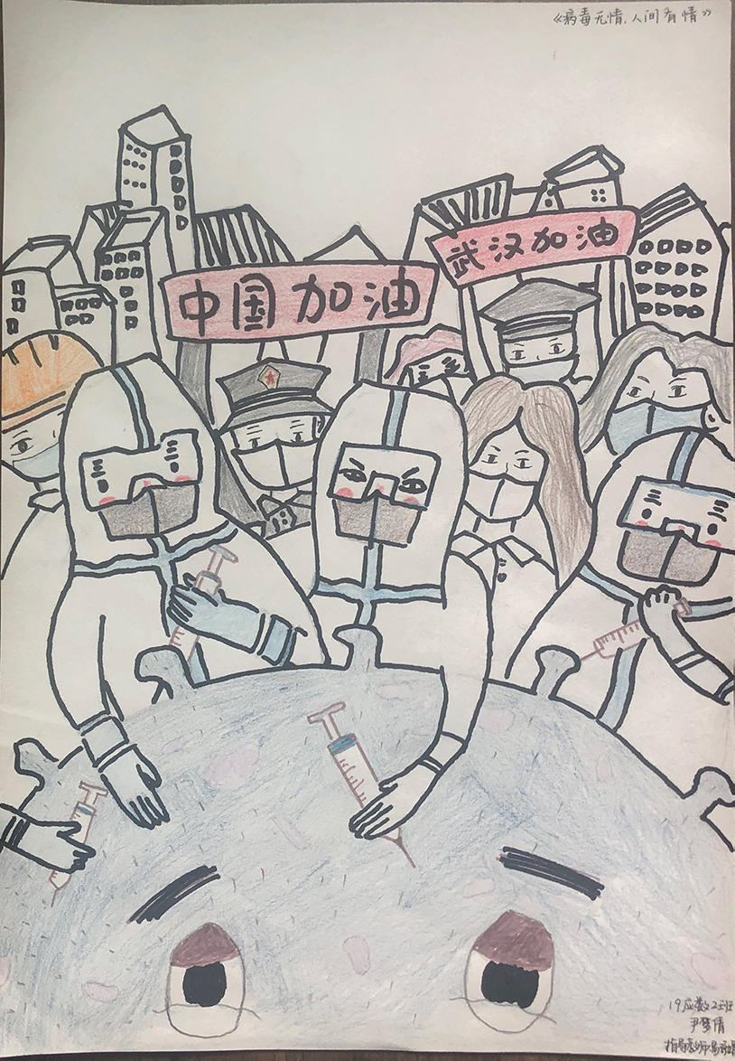 简笔画教学是《美术基础》课程内容中的重要组成部分,教学重点在于加强师范生的简笔画绘画技能,提高美术素养与多元化教学能力,为今后的教学实践打下基础。这次主题创作活动是课程组孙冰、曾素艳、谭媛元、吴瑕、易琼娟五位教师共同探究新时代课堂教学中“课程思政”的一次教学实践。针对抗击疫情期间师生们对抗疫进展与社会现象的关注,结合美术创作“以人民为中心”的指导思想,课程组五位教师通过多次研讨课程内容与授课方式,决定结合慕课平台线上教学进度与课程内容,组织所授班级包括科教、体育、音乐、应数等十个专业926名员工(师范类非美术学专业)共同参与“战疫情·爱不隔离”简笔画主题创作。同学们在掌握简笔画学习与表现规律的同时,将抗疫期间的英雄事迹、感人镜头用画笔展现,将感动之情运用隐喻、借喻、拟人或直抒胸臆等多种手法表现,表达青年的爱国情怀与内心感悟。课程组五位教师在十个班级中选出了75幅优秀作品进行线上展览,呈现出不同学科专业员工们凭借艺术的力量以“艺”抗“疫”。