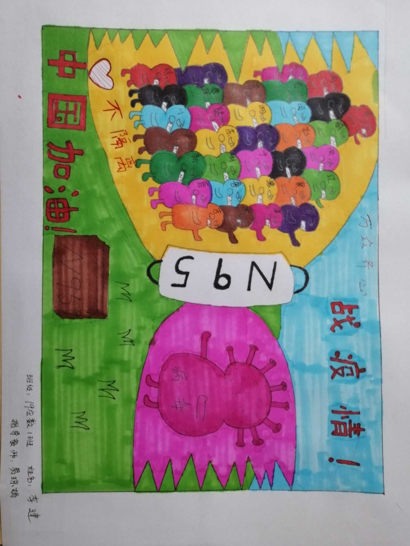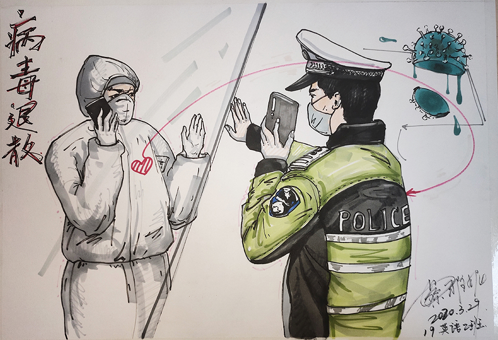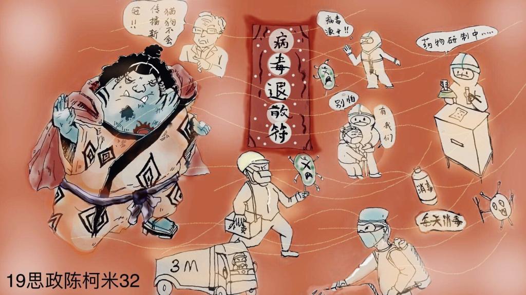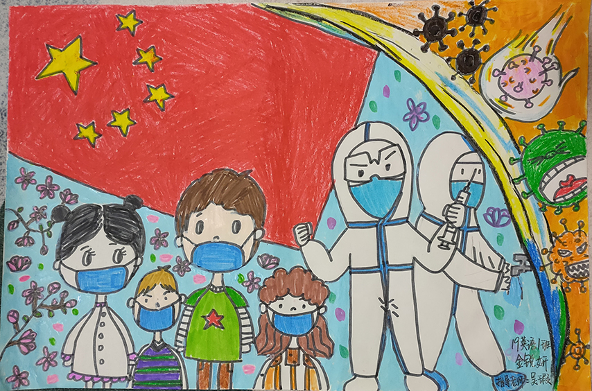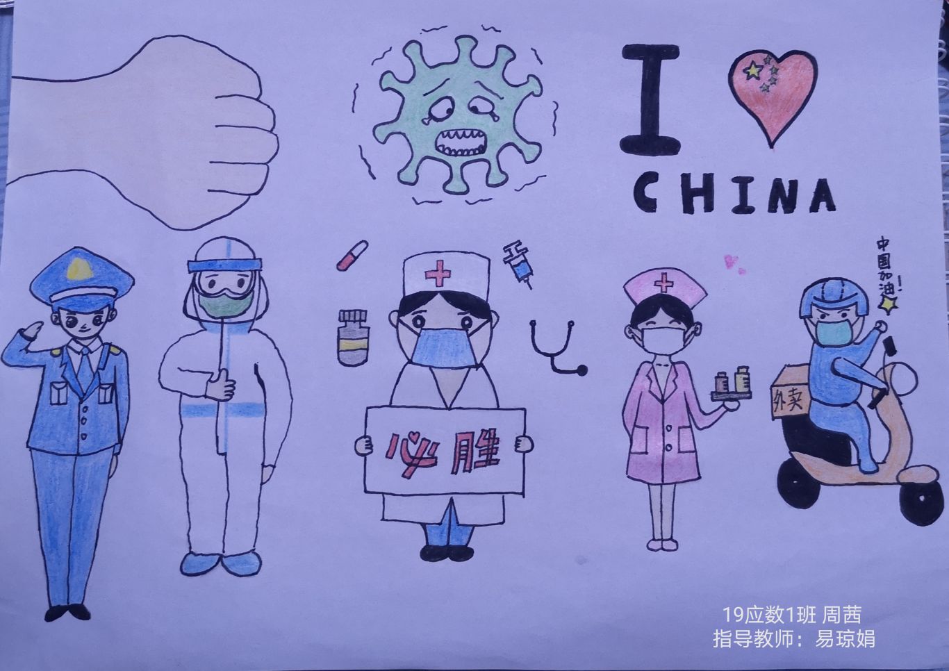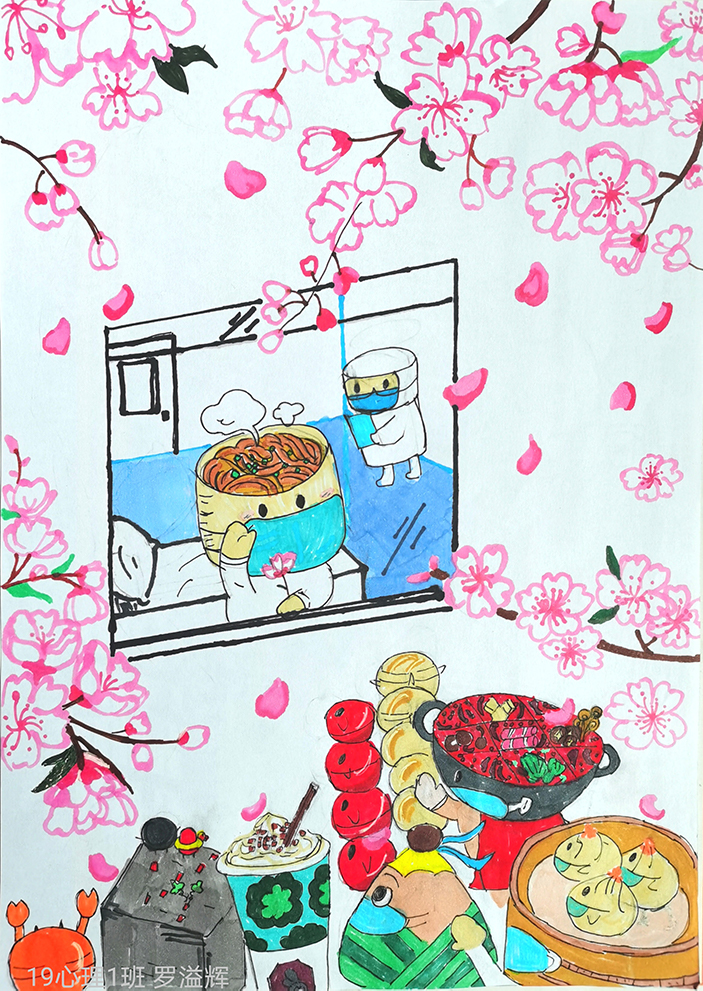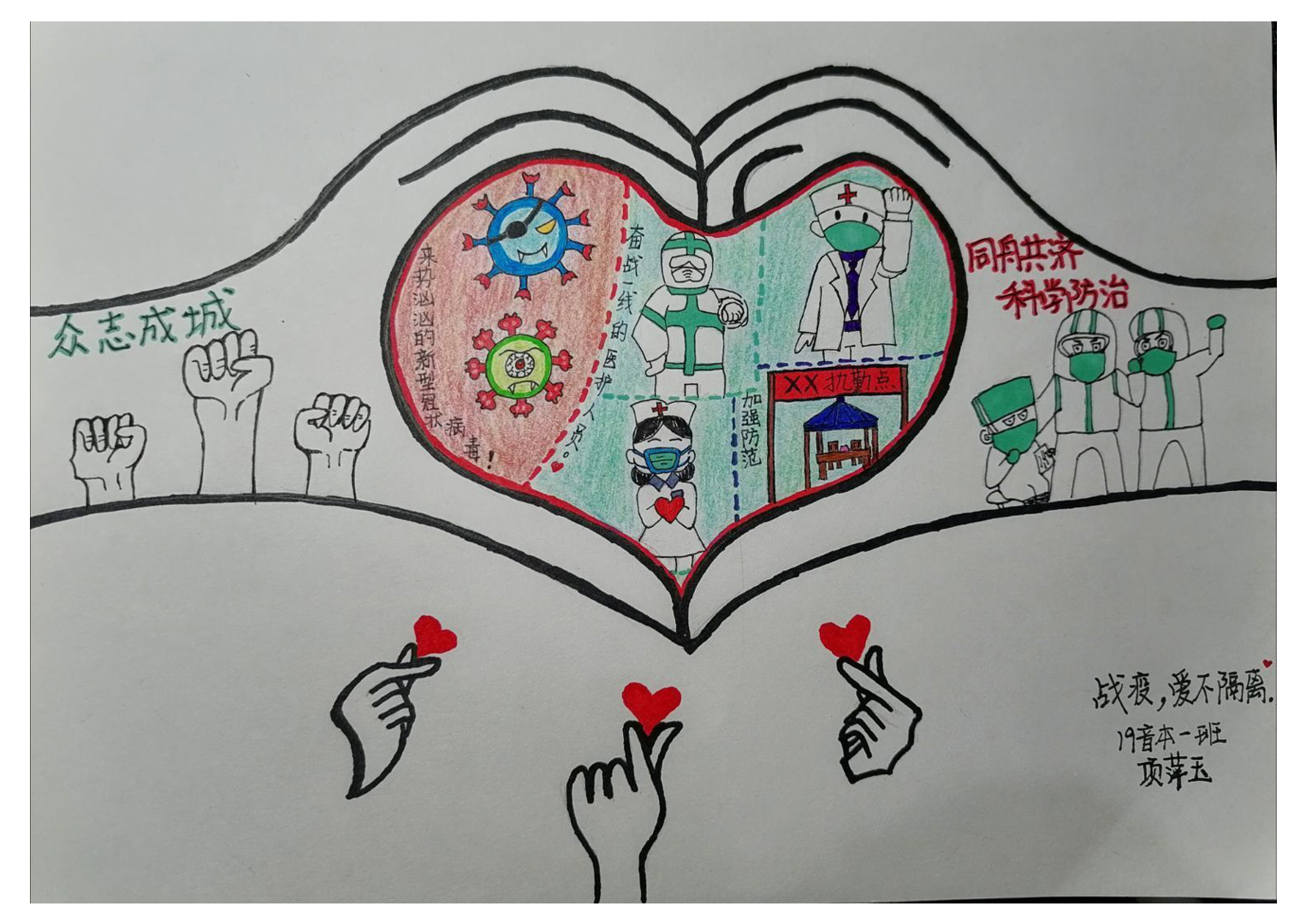 简笔画教学是《美术基础》课程内容中的重要组成部分,教学重点在于加强师范生的简笔画绘画技能,提高美术素养与多元化教学能力,为今后的教学实践打下基础。这次主题创作活动是课程组孙冰、曾素艳、谭媛元、吴瑕、易琼娟五位教师共同探究新时代课堂教学中“课程思政”的一次教学实践。针对抗击疫情期间师生们对抗疫进展与社会现象的关注,结合美术创作“以人民为中心”的指导思想,课程组五位教师通过多次研讨课程内容与授课方式,决定结合慕课平台线上教学进度与课程内容,组织所授班级包括科教、体育、音乐、应数等十个专业926名员工(师范类非美术学专业)共同参与“战疫情·爱不隔离”简笔画主题创作。同学们在掌握简笔画学习与表现规律的同时,将抗疫期间的英雄事迹、感人镜头用画笔展现,将感动之情运用隐喻、借喻、拟人或直抒胸臆等多种手法表现,表达青年的爱国情怀与内心感悟。课程组五位教师在十个班级中选出了75幅优秀作品进行线上展览,呈现出不同学科专业员工们凭借艺术的力量以“艺”抗“疫”。