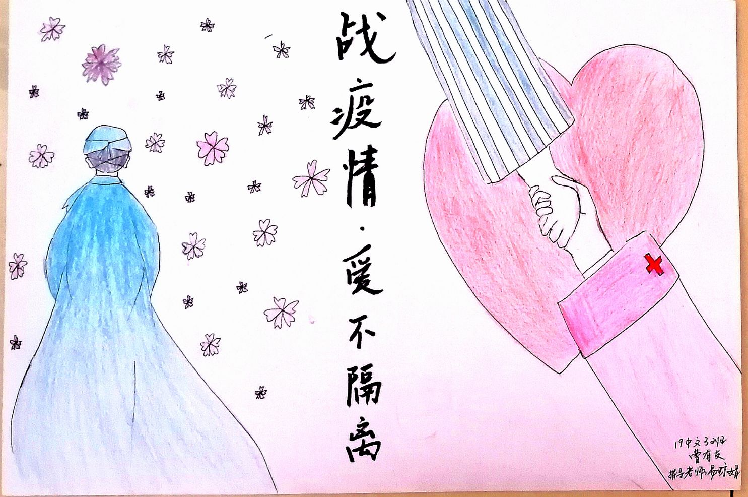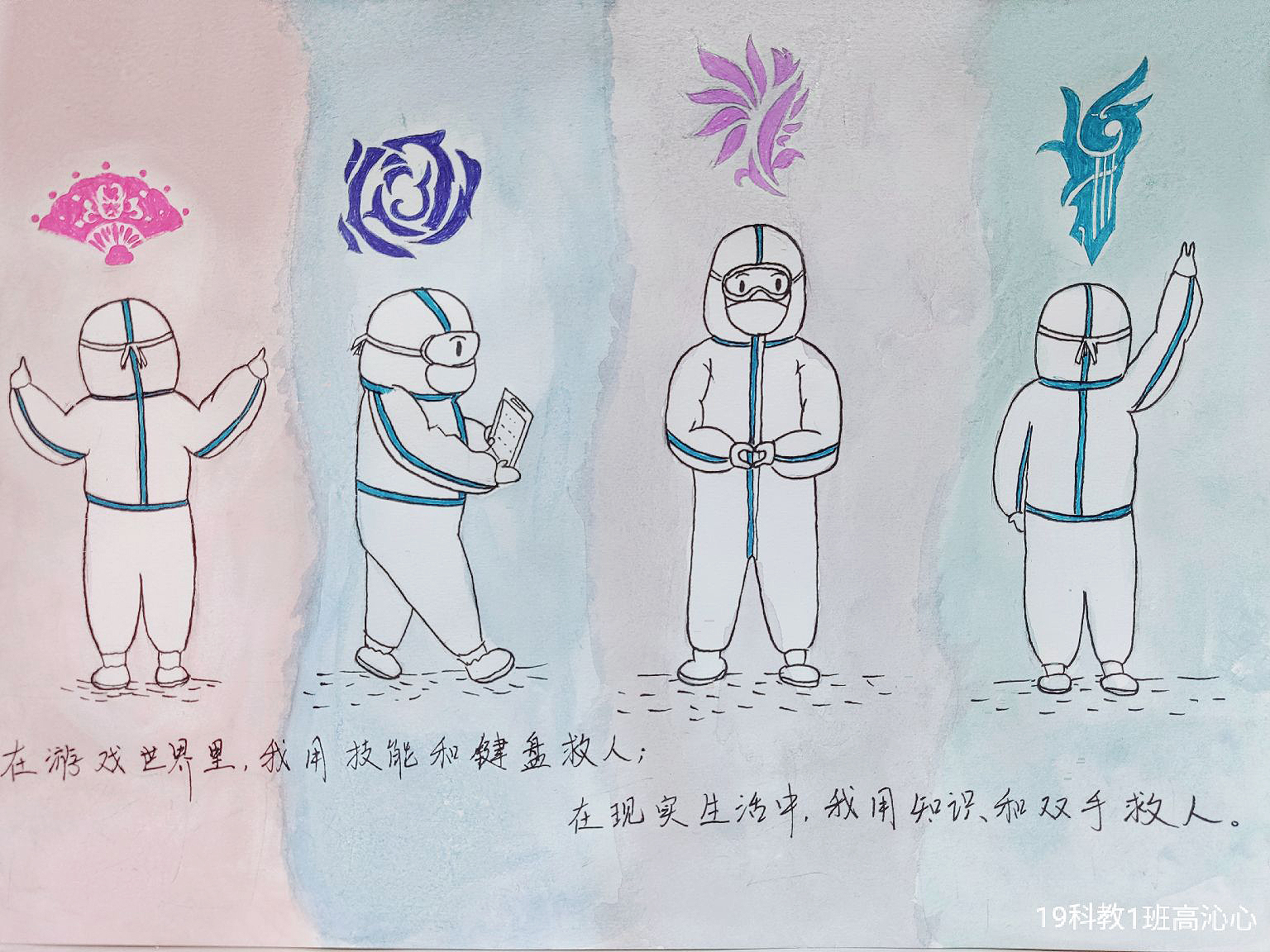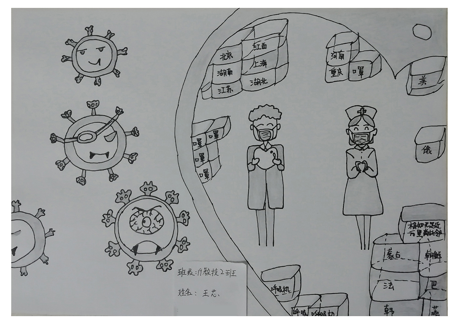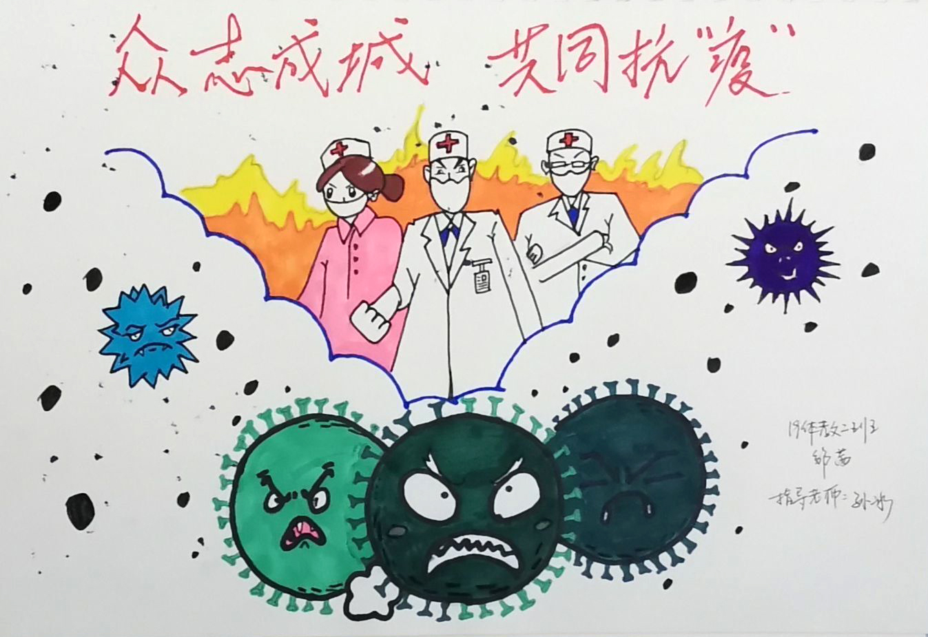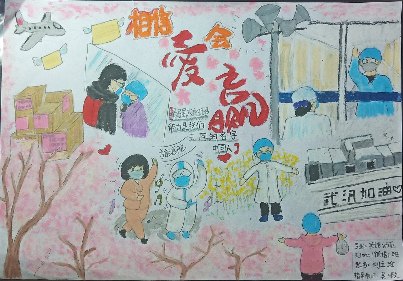 简笔画教学是《美术基础》课程内容中的重要组成部分,教学重点在于加强师范生的简笔画绘画技能,提高美术素养与多元化教学能力,为今后的教学实践打下基础。这次主题创作活动是课程组孙冰、曾素艳、谭媛元、吴瑕、易琼娟五位教师共同探究新时代课堂教学中“课程思政”的一次教学实践。针对抗击疫情期间师生们对抗疫进展与社会现象的关注,结合美术创作“以人民为中心”的指导思想,课程组五位教师通过多次研讨课程内容与授课方式,决定结合慕课平台线上教学进度与课程内容,组织所授班级包括科教、体育、音乐、应数等十个专业926名员工(师范类非美术学专业)共同参与“战疫情·爱不隔离”简笔画主题创作。同学们在掌握简笔画学习与表现规律的同时,将抗疫期间的英雄事迹、感人镜头用画笔展现,将感动之情运用隐喻、借喻、拟人或直抒胸臆等多种手法表现,表达青年的爱国情怀与内心感悟。课程组五位教师在十个班级中选出了75幅优秀作品进行线上展览,呈现出不同学科专业员工们凭借艺术的力量以“艺”抗“疫”。