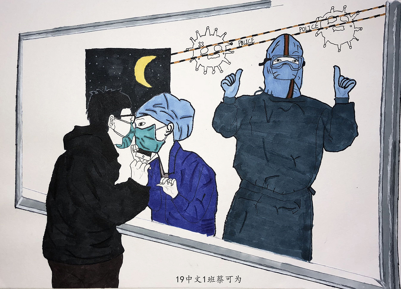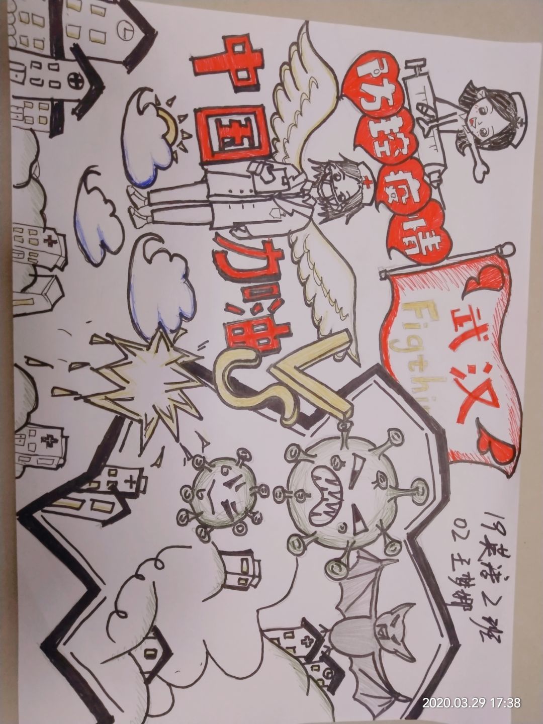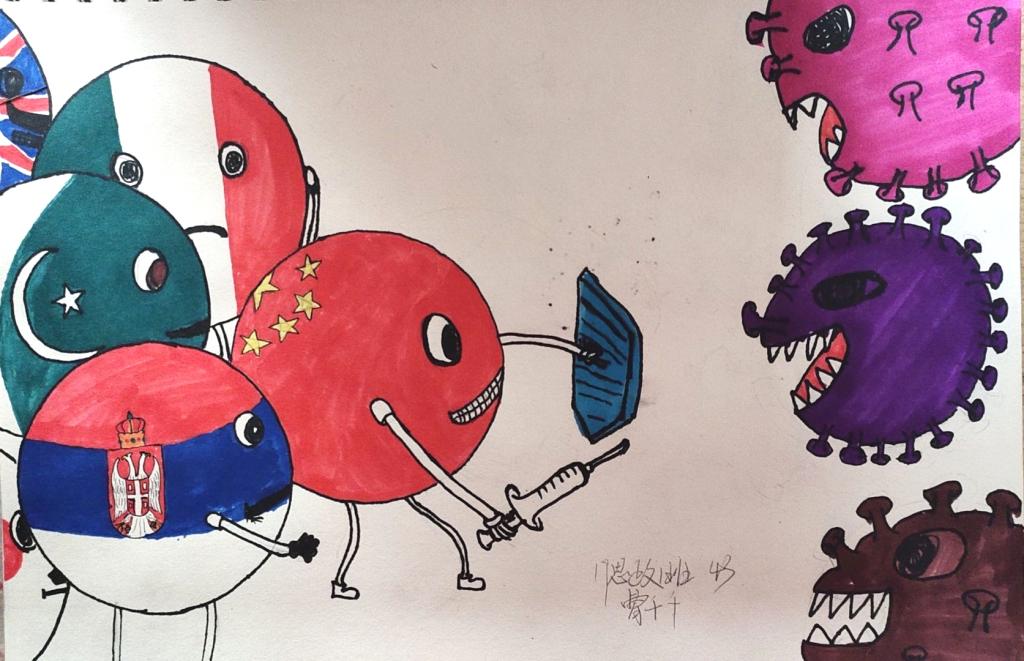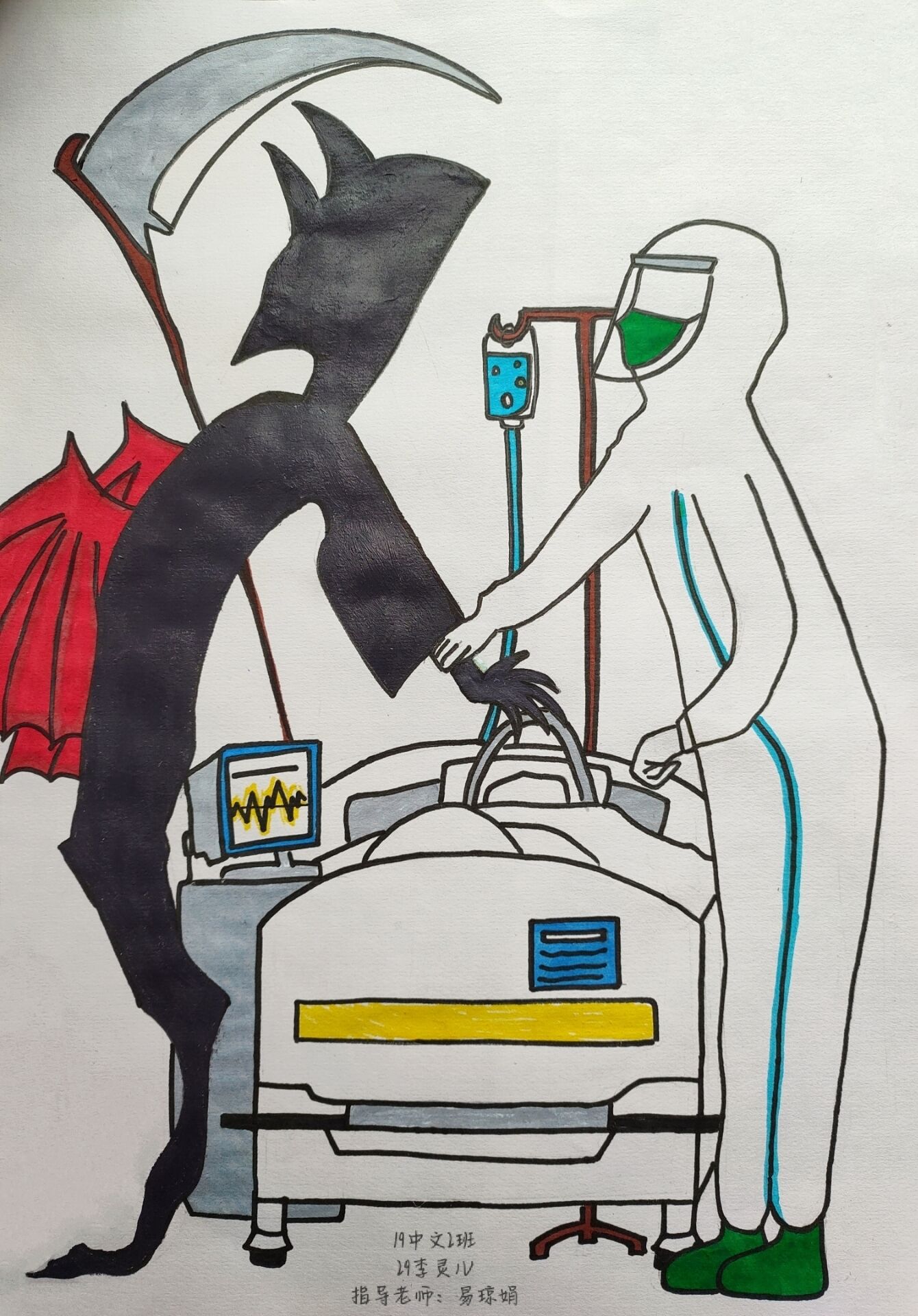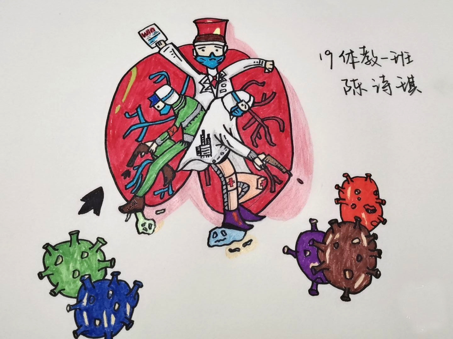 简笔画教学是《美术基础》课程内容中的重要组成部分,教学重点在于加强师范生的简笔画绘画技能,提高美术素养与多元化教学能力,为今后的教学实践打下基础。这次主题创作活动是课程组孙冰、曾素艳、谭媛元、吴瑕、易琼娟五位教师共同探究新时代课堂教学中“课程思政”的一次教学实践。针对抗击疫情期间师生们对抗疫进展与社会现象的关注,结合美术创作“以人民为中心”的指导思想,课程组五位教师通过多次研讨课程内容与授课方式,决定结合慕课平台线上教学进度与课程内容,组织所授班级包括科教、体育、音乐、应数等十个专业926名员工(师范类非美术学专业)共同参与“战疫情·爱不隔离”简笔画主题创作。同学们在掌握简笔画学习与表现规律的同时,将抗疫期间的英雄事迹、感人镜头用画笔展现,将感动之情运用隐喻、借喻、拟人或直抒胸臆等多种手法表现,表达青年的爱国情怀与内心感悟。课程组五位教师在十个班级中选出了75幅优秀作品进行线上展览,呈现出不同学科专业员工们凭借艺术的力量以“艺”抗“疫”。