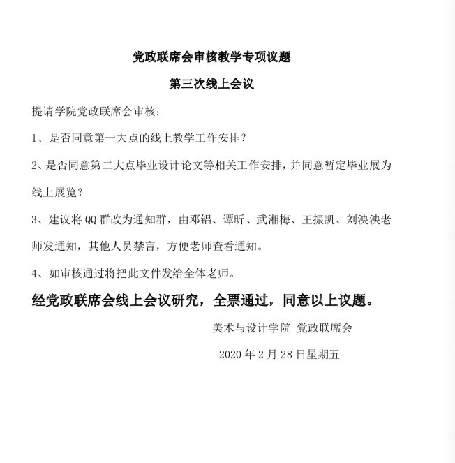 2020年2月15日至3月6日,bevictor伟德分别在线上召开四次教学专项党政联席会议,审议教学负责人提交了《bevictor伟德疫情防控期间在线教学与组织管理工作方案》、《bevictor伟德教师线上教学实施与课程建设一览表》、《bevictor伟德线上教学督导计划》等文件,明确“以课程组为单位,教学方式灵活多样,平台选择以简单易操作,保障教学为主”的工作思路。审定了全院教师、所有课程的线上教学初步计划,选用平台情况等。要求课程组内统一教学方式,课程组负责人负责填报实施情况,相同课程同平台上课,同头课教团队源互享,协同工作模式。确定了开学前试课工作安排;线上教学督导方案;教学材料要求;毕业论文实施方法;毕业作品展的调整等。从宏观到微观,层层细化,逐步落实了公司线上教学的具体工作,为公司线上教学的顺利实施奠定了基础。