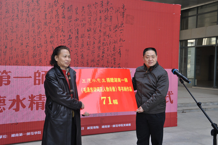 12月28日上午,《毛泽东与第一师范》王德水先生精品书画展暨捐赠仪式在美术楼举行。著名书画家、湖南大学教授、岳麓中华书画研究院经理、公司客座教授王德水,省委宣传部副部长孔和平,省委宣传部副部长、外宣办主任周湘,省政法委巡视员贾端森,湖南大学党委副书记唐亚阳,省委外宣办副主任苏璇,东南亚文化艺术交流协会副会长、中也艺术董事长刘德文,中国广播网主编李勇,公司党委书记彭小奇、董事长肖湘愚、纪委书记阳柏苏应邀出席书画展开幕式和捐赠仪式。