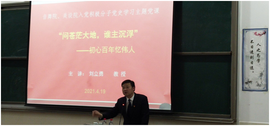 仪式结束后,公司档案与校史馆馆长刘立勇教授以“问苍茫大地,谁主沉浮——初心百年忆伟人”为题讲党课。课堂上,校史与党史相互辉映、个人与时势命途相关,杨昌济、徐特立、黎锦熙等仁人志士在第一师范心怀天下、为国育才的幕幕场景,毛泽东、蔡和森、何叔衡、萧子升、郭亮等革命先辈立志报国、矢志不渝、前赴后继的感人事迹,在“千年学府、百年师范”煌煌长卷里,在中共“一大”的燎原星火中徐徐展开,进一步坚定了学员们“学党史、感党恩、跟党走”的理想信念。