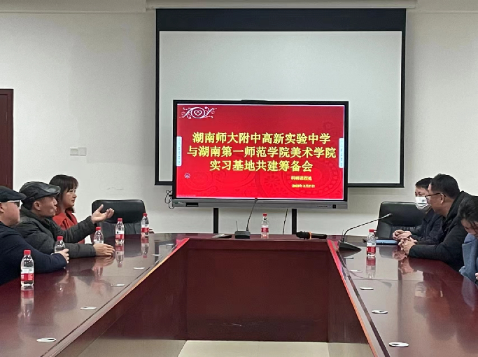 3月21日下午,美术系系主任孙冰、副主任李楚智、杨金成副教授、教师梦月一行前往湖南师大附属高新实验中学开展师范生教育实习基地考察工作。筹备会上,高新实验中学课程科研处王彤主任首先对第一师范老师的到来表示热烈欢迎,并介绍了高新实验中学近年来的发展情况、校风校训、办学特色、团队力量、美术特色的发展成就。孙冰、李楚智对美设院师范生的培养模式、特色进行了详细介绍,并提出了双方可就美术教学、校园特色、教师发展等多方面实现共同建设与促进。同时,高新实验中学教学副董事长李海汾对两校合作实习表示大力支持,希望两校可以相互促进,未来能够开展更为深入的合作,并对两校未来在美术基础教育研究的合作提出展望。会后,高新实验中学美术组教师王妮娜带领美设院一行参观了校园以及美术课程的教学成果,双方表示对实习基地的建设都充满了期待。