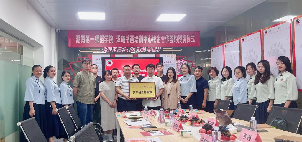 在深入了解了泽曦书画的创业历程、公司产品特色、办学基础设施以及书法教育的开展情况后,公司考察团对泽曦书画的艺术教育理念表示认同。座谈会上,双方就艺术人才培养、实习实训、就业创业等方面进行了深入交流和探讨。公司考察团表示,泽曦书画公司的教育理念和实践经验对公司的艺术教育具有重要的借鉴意义,双方可以在课程设置、教学方法、团队培训等方面开展深度合作,共同推动艺术教育的创新与发展。同时,泽曦书画公司的代表也对公司的艺术教育表示了浓厚的兴趣,他们希望借助公司的教育资源和平台,为更多员工提供优质的艺术教育和实践机会。双方代表在友好协商的基础上,签署了校企合作协议,并正式授予泽曦书画公司“产学研合作基地”牌。